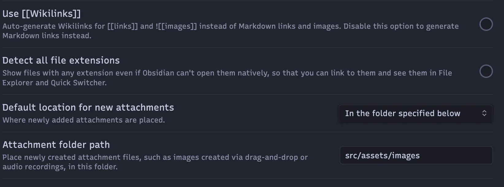 - Make sure to disable Wikilinks so your images link properly, as well as to properly set the default location for your new attachments. These options are also under Files and Links.